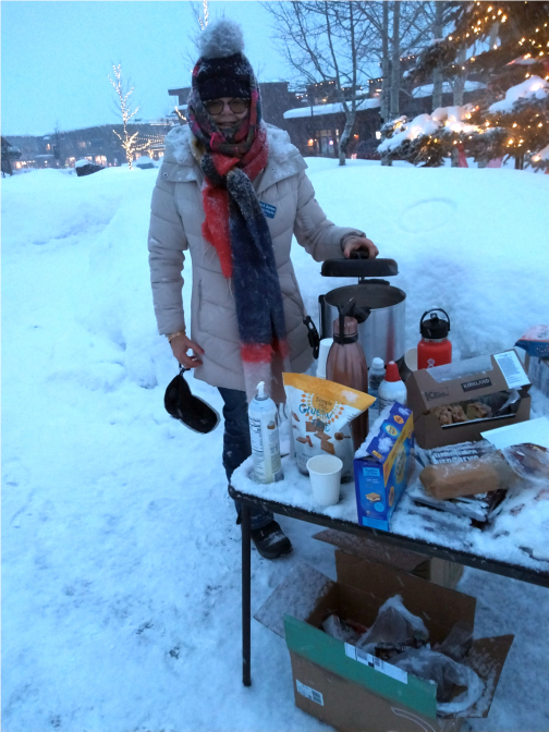 S'Mores and hot chocolateClub member Sharon manned the hot chocolate kettle for our Big Sky seasonal workers, who made s'mores at Firepit Park. A number of brave kids made it in spite of the cold and impending snowstorm. ![]() |